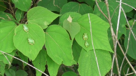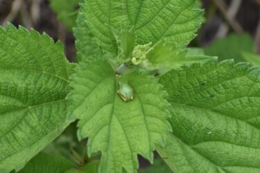 梅雨時のこの季節にアカメガシワの葉の上に座っている姿を見て、やはり梅雨時だからかなと思いました。