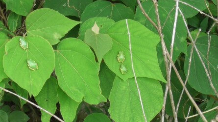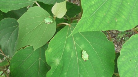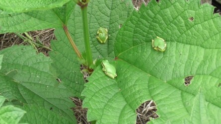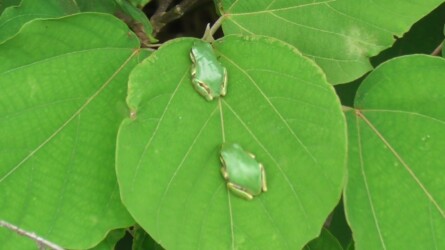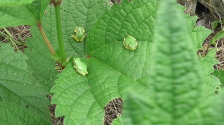 少し先まで歩いていくと、イラクサ科のヤブマオがたくさん生えていて、その葉の上にもアマガエルがところどころに座っています。
