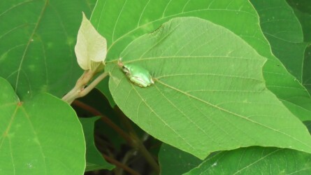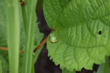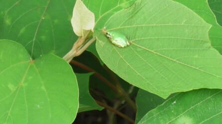 そんな場面に出会えればと思いながら、沼を過ぎて先の雑木林の脇を歩いていくと、アカメガシワの葉の上にアマガエルが座っていました。