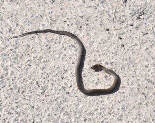 数日前に蟹江新田にある日光川と佐屋川の間の土手を歩いていたら、コンクリートの道路上を長さ1.5メートル位のアオダイショウが移動しているのを見かけました。