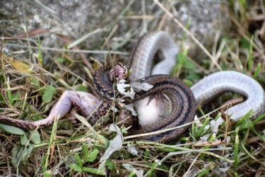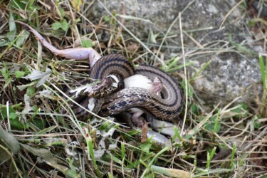 カエルを絞めているシマヘビ