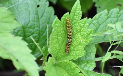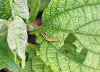 ヤブマオに取りついた蛾の幼虫と蛹