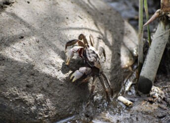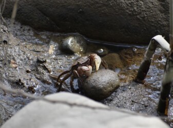 今回見かけたカニは黒っぽかったのですが、数年前に見かけたものには赤いハサミがあるものもいました。