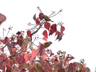 「野鳥と木の実 ハンドブック」(叶内拓哉 文一総合出版)にはナンキンハゼでは「庭木や公園樹、街路樹などに植栽されている。紅葉が美しいことから、近年は植えているところが多くなってきた。実が熟すのは11月頃で茶色く、それが裂開すると中から白っぽい種子が見える。それは実は種子を覆う皮で、その中に本当の種子がある。種子は人間には有毒と伝えられているが、鳥は平気で採食する。私が観察した鳥はキジバト、ヒヨドリ、ジョウビタキ、ツグミ、メジロ、イカル、シメ、スズメ。これらの鳥は毒性に強いのか、毒を中和する機能があるのか、私にはわからない。」と記されています。