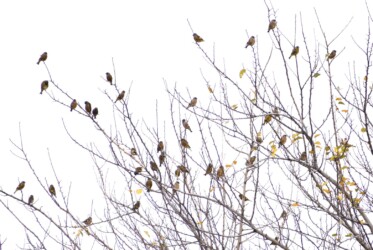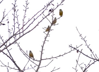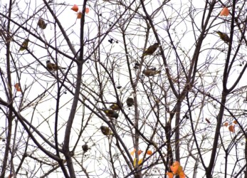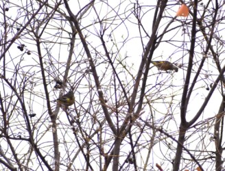 一年前に見かけた光景と同じだったのですが、群れなのでそれぞれのカワラヒワが実を啄んでいたのです。