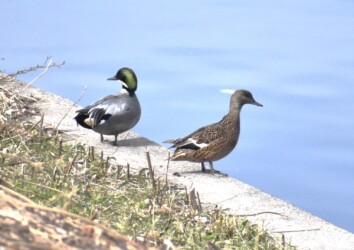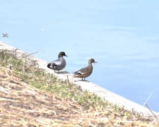 2023年12月19日に日光川と佐屋川の間の土手を歩いていくと、佐屋川にヨシガモのオスとメスの2羽が護岸のコンクリートにいました。