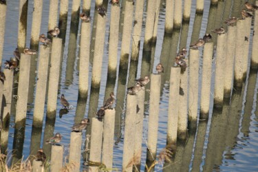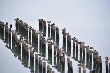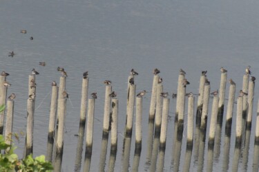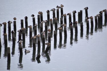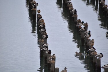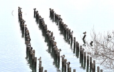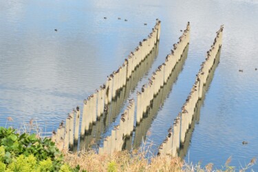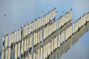 2月17日にその土手を歩いていくと、その杭にたくさんのマガモが杭にとまって休んでいました。