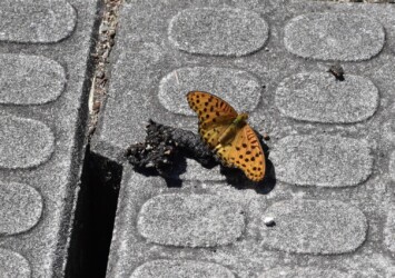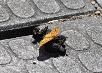 それを探しながら歩いていると、沼を回る遊歩道で獣糞に取りついているヒョウモンチョウを見かけました。