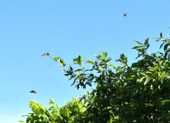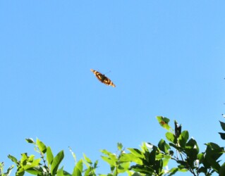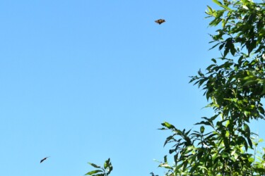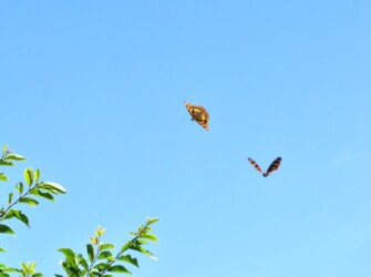 ヤナギの樹冠で飛翔しせめぎ合うコムラサキ