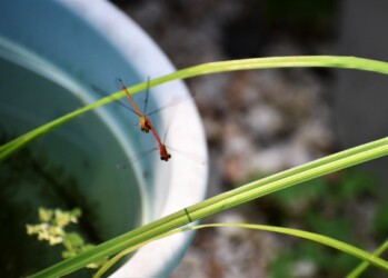 自宅の狭い庭には、7年程前から準絶滅種のベニイトトンボが羽化しています。