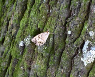 そんなことから、蟹江周辺ではカシの仲間が多いのだと思い込んでいたのですが、海津市森下の神社の境内を歩いていたとき、コナラだと思われる大きな木の幹に中型のチョウがとまっているのを見かけました。