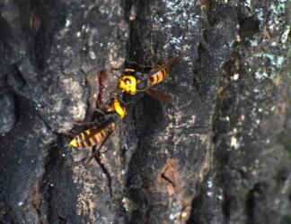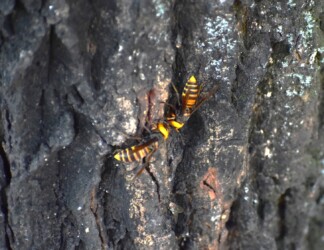 こうしたチョウたちが集まってきていますが、その樹液が出ていると思われる場所はスズメバチが独占していて、チョウが近づくと追い払っています。
