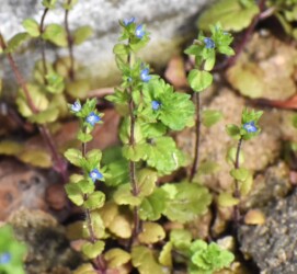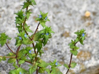 「日本の野草」(林弥栄編 山と溪谷社)には「ヨーロッパ原産で明治初期に渡来し、今では全国的な雑草となっている越年草。茎は根もとで枝分かれして横に広がり、なかなか大きな株となる。葉は卵円形で一~五センチの柄があり、ふちには鈍い鋸歯がある。茎の下部では対生し、上部では互生する。葉のわきに一個ずつ花をつける。花柄は一~二センチあり、花冠はルリ色で七~十ミリあり、なかなか美しい。花期は三~五月。生育地は畑、道ばた。分布は帰化植物。」と示されています。