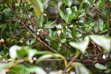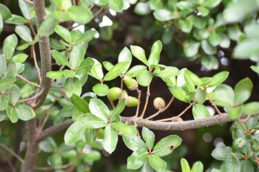 「庭木図鑑 植木ペディア」のウバメガシには「関東以西の沿岸部や低山に見られるカシ科の常緑高木。カシの仲間のうち最も都市環境に強いことから、かつて関西地方ではカイヅカイブキと共に垣根としての利用が多かった。~中略~ 材質が緻密で硬く、炭焼窯で焼いたウバメガシの材は『備長炭(びんちょうずみ)』として知られ、焼き鳥、ウナギの蒲焼、焼き肉、炭焼き焙煎コーヒーなどに使われる。備長炭は着火までに時間を要するが、一旦火が点けば一日中持つ優れもの。『備長』とは、元禄時代にこの炭を初めて作ったとされる現和歌山県田辺市の備長屋長左衛門の名に由来する。ウバメガシは中国や朝鮮半島にも分布しており、現在流通する備長炭は輸入品が多いが、薪炭用に植栽された名残のような林が今も各地に見られる。『ウバメ』とは『姥芽』のこと。今の時代では考えられないが、ウバメガシの新芽あるいは若葉が茶色く、これを老女に見立てたのが名の由来。~中略~ 雌花の後にできるドングリは長さ1~2センチの楕円形で、殻斗と呼ばれる小さな帽子のような部分は鱗状になる。ドングリが茶褐色に熟すのは翌年の秋のことで、開花した年はごく小さな葉芽のような状態で越冬する。食用になるが、枝から落ちやすく収穫のタイミングが難しい。繁殖は実生あるいは挿し木による。」と記されています。