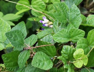 「野草・雑草の事典530種」(金田初代 洋一郎 西東社)には「茎、葉柄、花軸に黄褐色の下向きの毛が生えています。つる性の茎がほかの植物に巻きついて長く伸び、長い柄をもつ3出複葉の葉を互生します。葉腋から出る葉よりも短い花軸に蝶形花が数個かたまってつきます。花後、豆果をつけますが、地中に閉鎖花をつけ結実するので、地上と地中に豆果ができます。名は、やぶに生える豆の意味。」と記されています。