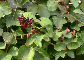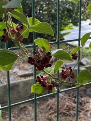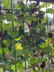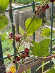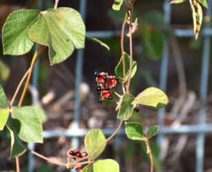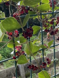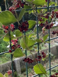 公園内を歩いていくと、フェンスにタンキリマメが絡みついて、たくさんの莢や黒いタネが見られました。