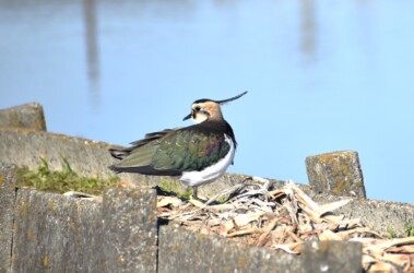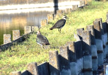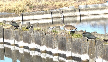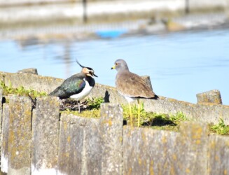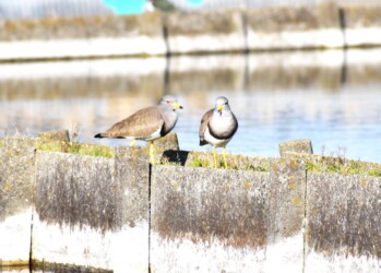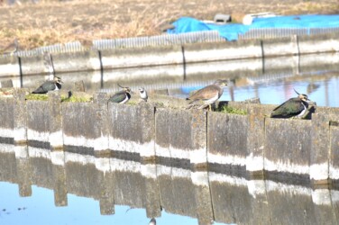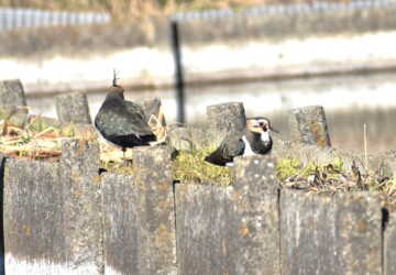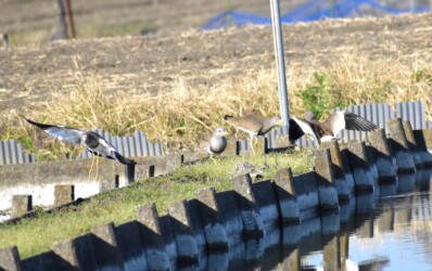 タゲリとケリが養殖池の通路で一緒に日向ぼっこしていた!