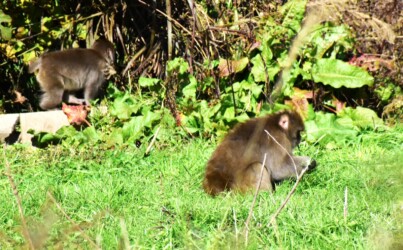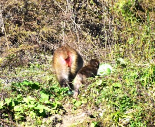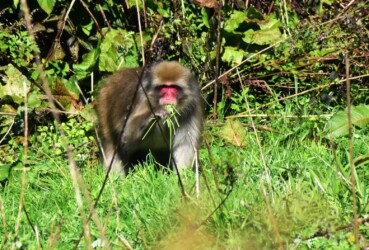 そのサルには、ボスザルと思われるもの、今年生まれたと思われる子ザルなどもいて、それぞれ叢で草を食んでいました。