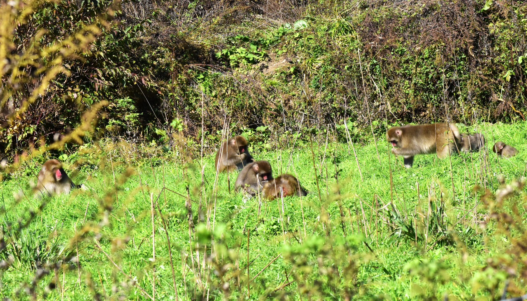 何頭ものサルが、叢の草の葉を食べているのを見て、ニホンザルはカキや、木の実などを食べるものだと思い込んでいたので、何か驚いてしまったのでした。