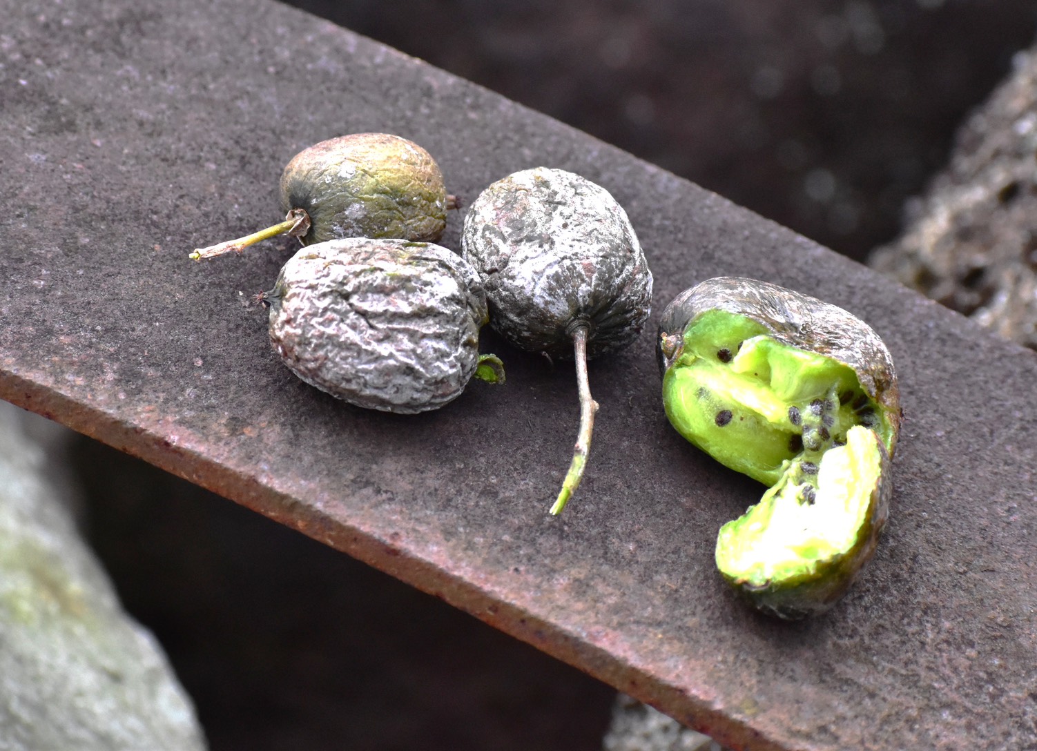 また外見の実の形はキウイの小さい感じだったのです。その実の1つを割いて見ると、なんとキウイと同じ緑色の果肉だったのです。