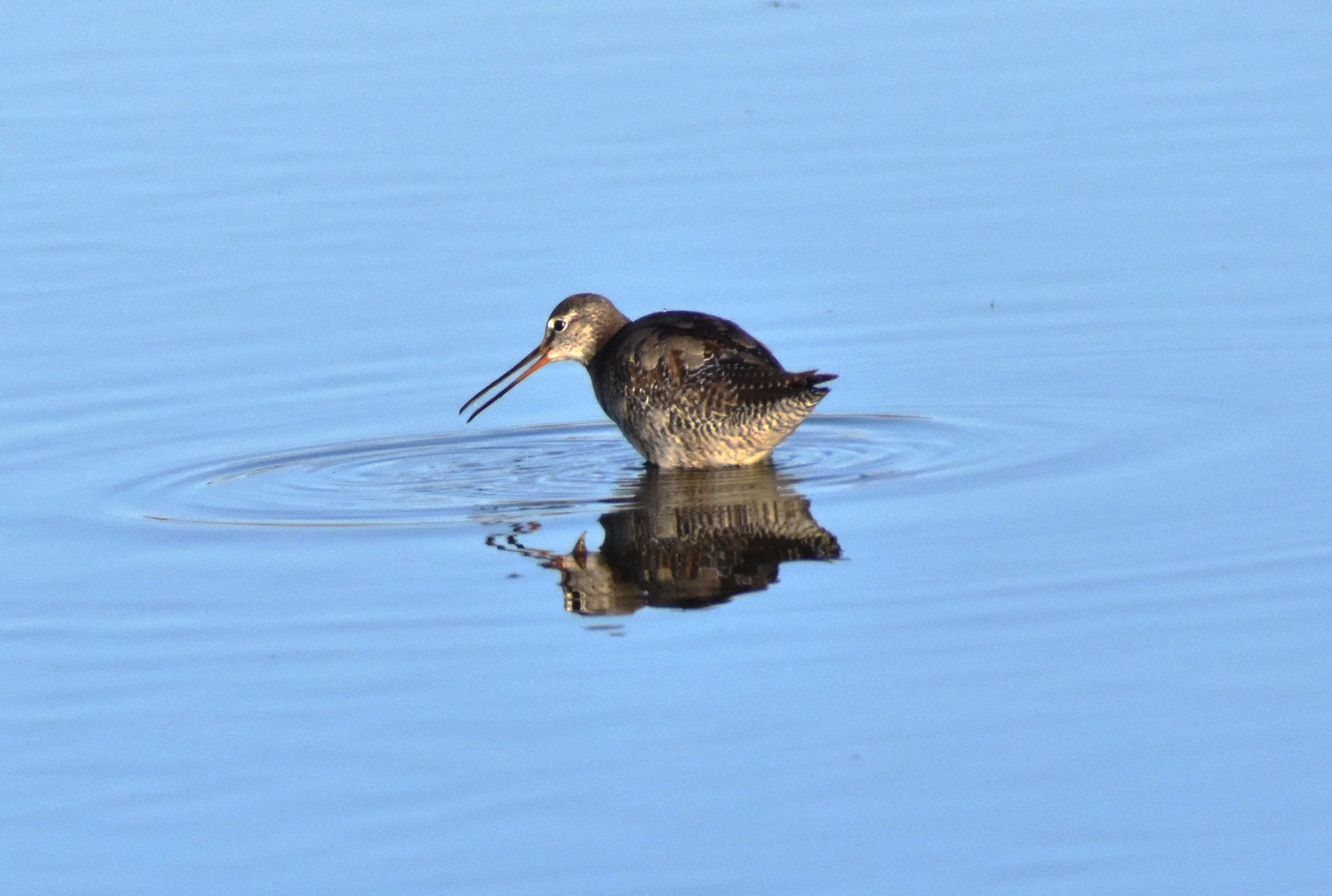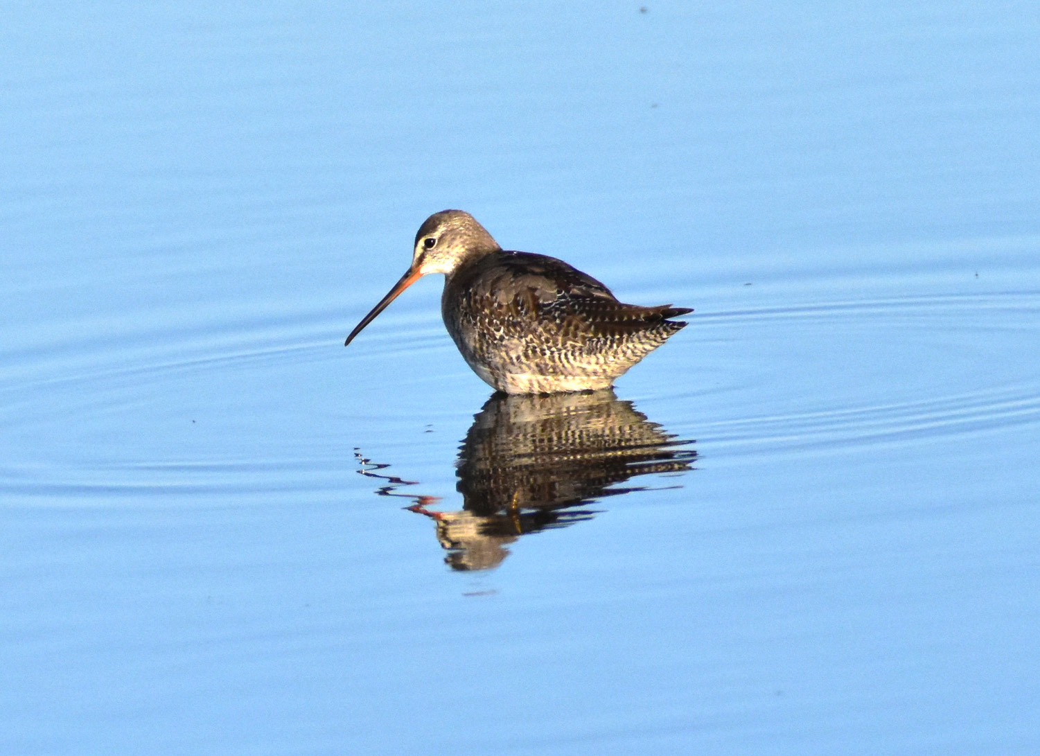 その金魚養殖放棄池は、水深が割と深く、脚が長いセイタカシギでも、その足が見られないほどなのに、このツルシギも体が水面上にみられたものの、脚の黄色の様子は見られませんでした。