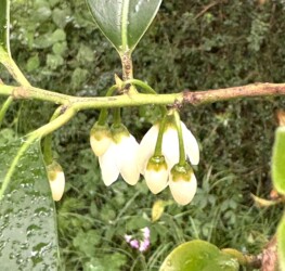 このサカキは花が咲いて実ができると、秋には黒い実になると聞いていました。そこで8月頃からその実の様子を何度も確かめに行っていましたが、10月に行った時もまだ青いままだったのです。