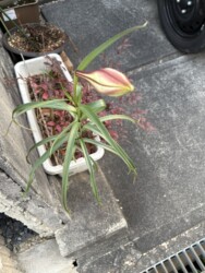 蟹江の自宅にもシンテッポウユリが進出してきて、自宅の玄関先や狭い庭で花を咲かせるようになってきました。