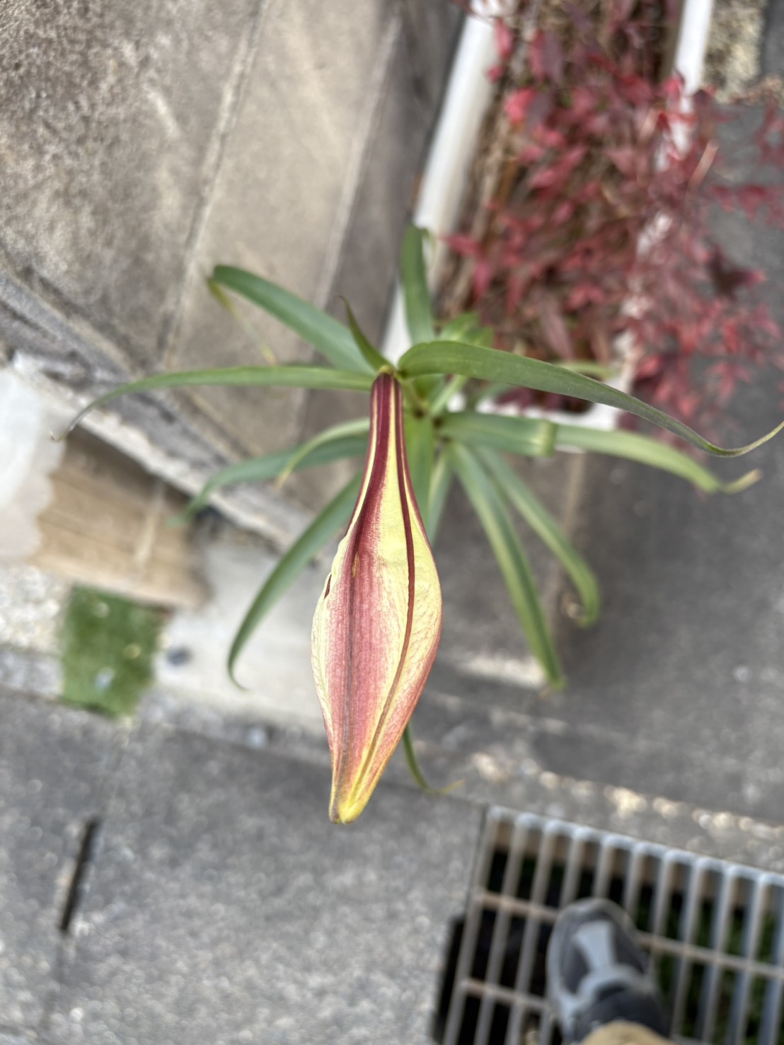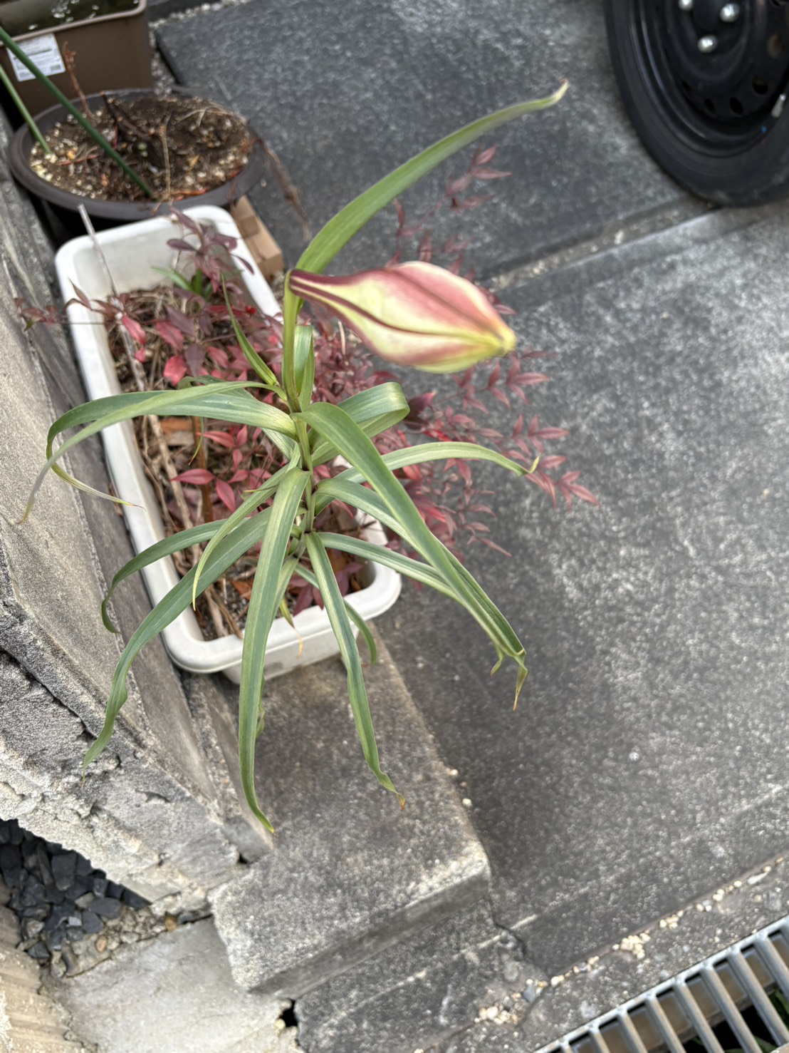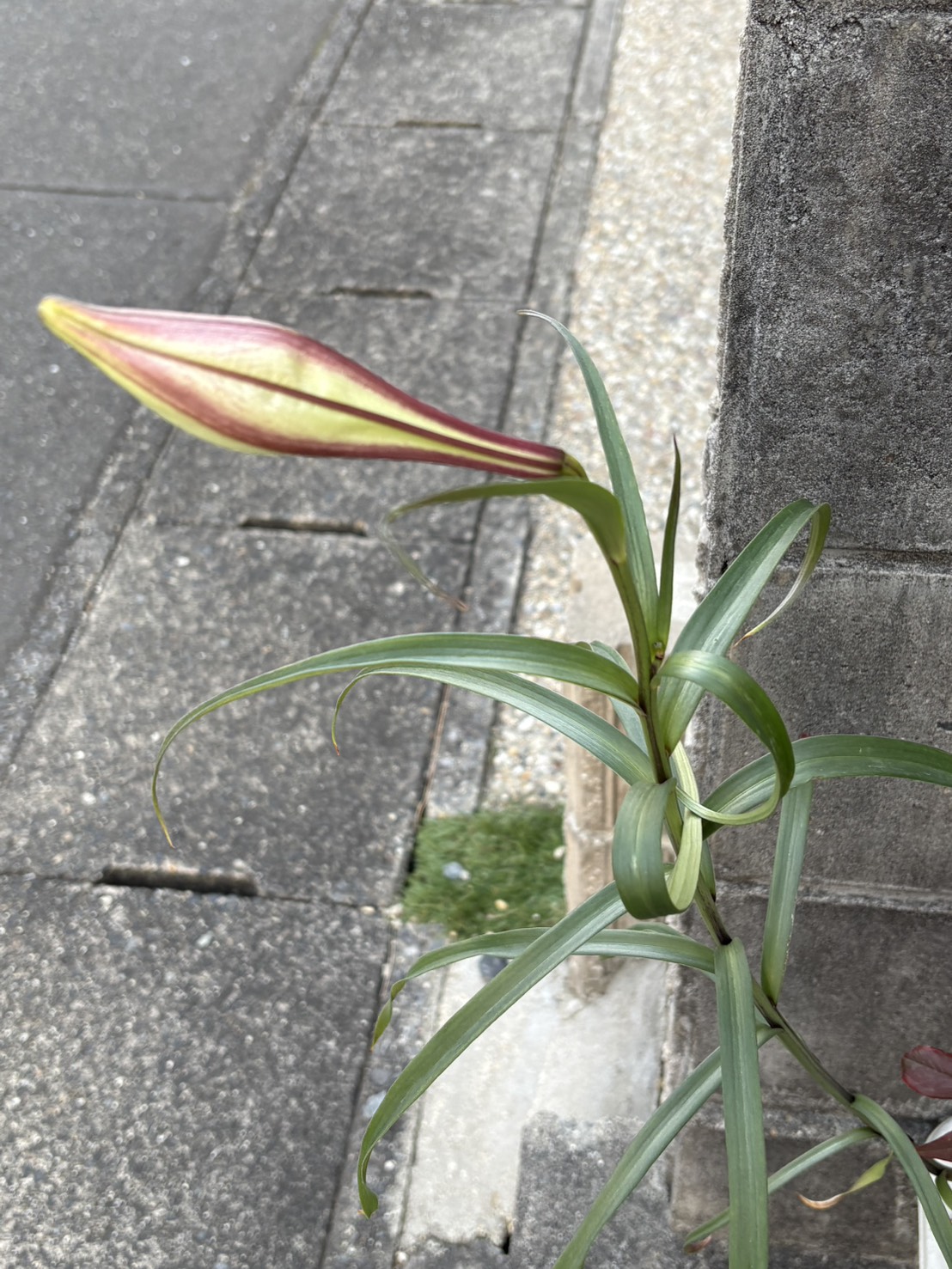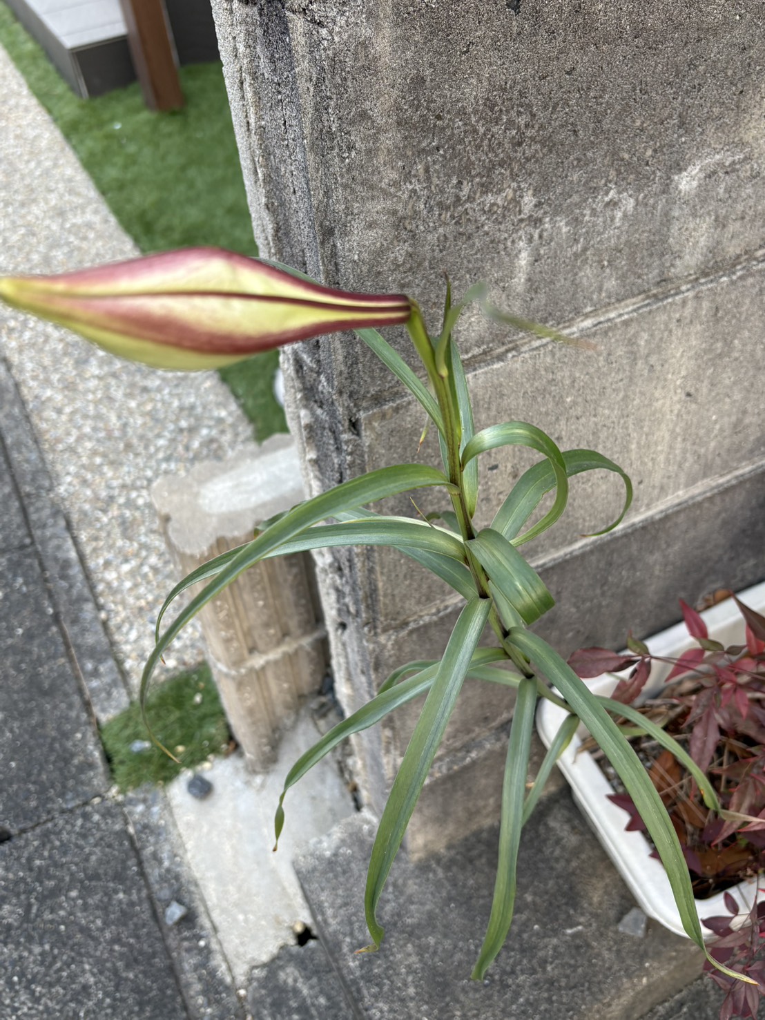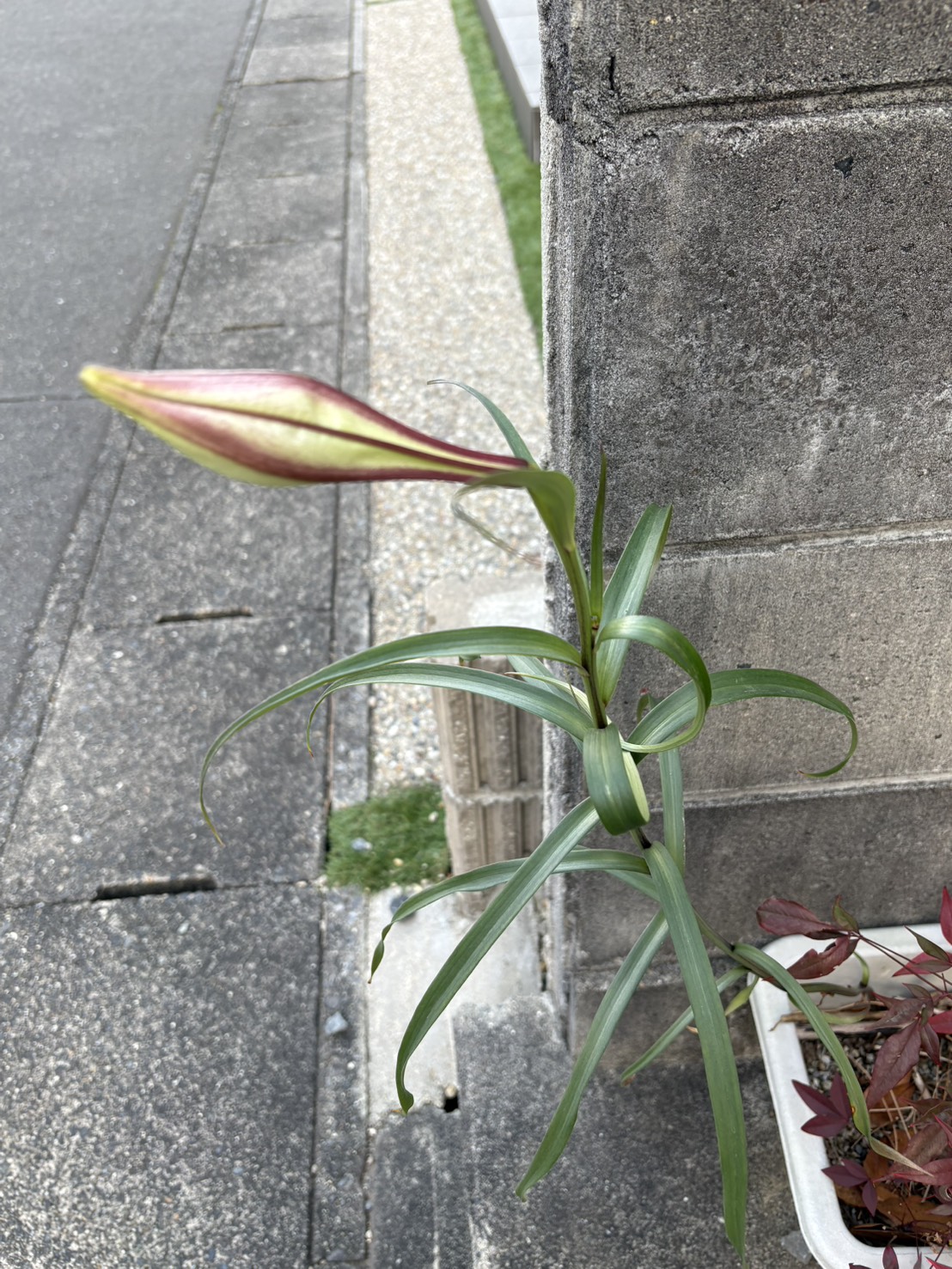 このユリだと思われる花が、自宅の駐車場脇のプランターに12月末から1月20日にかけて、ツボミをつけ始め、だんだんと膨らんできているのです。