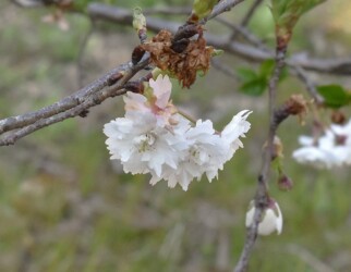 少し弱弱しい木に思える風情でしたが、その木には小さくて八重でしかも白いサクラが咲いていました。