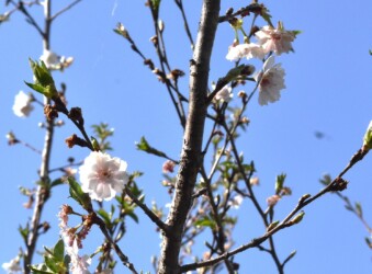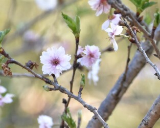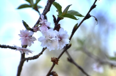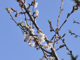 Azure Garden「コブクザクラ(子福桜)春と秋に花を咲かせるエドヒガン系の桜」には「花の特徴は、花色は淡い紅白色、花径は約二~三センチ、咲き方は八重咲き、花形は小ぶりで重なりのある花びら。また一つの花から複数(一~三個)の果実を結ぶことが特徴です。開花時期は(二期咲き)で、秋期は十月~十二月、春期は三月~四月頃。秋から咲き始め、冬の間も断続的に花が見られ、春に再び開花する二季咲きの桜です。同様に二季咲きの性質を持つ桜として、ジュウガツザクラ(十月桜)があります。樹木の特徴は、樹高早く四~八メートルの中型の木で、枝が上方へ伸びながら広がる樹形になります。花は比較的小ぶりですが、樹全体は高さがあり、見上げるような姿が印象に残りました。名前の由来は、『子福桜』という名称は、ひとつの花の中に複数の雌しべが見られることに由来するといわれています。実が多くなる様子にちなんで、縁起の良いサクラとして寺社や庭園に植えられることもあるようです。花が密に咲く様子も印象的で、実が多くなる性質と重なり、子沢山で縁起が良い桜と呼ばれる理由が感じられました。」と記されていました。