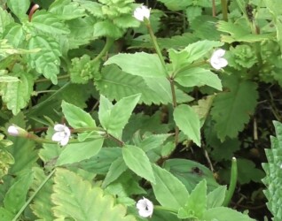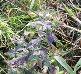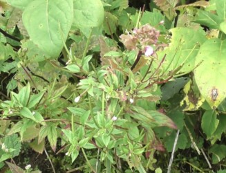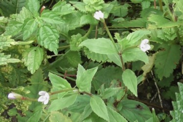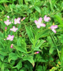 「日本の野草」(林弥栄編 山と渓谷社)のアカバナには「山麓や野原の水湿地に生える多年草。茎は円柱形で高さ30~70㌢になる。茎は対生し、しばしば茎を抱く。葉身は卵形または卵状楕円形で長さ2~6㌢、幅1~3㌢あり、ふちに鋸葉がある。茎と葉は赤みを帯びることもある。茎の上部に長さ5~10㍉の紅紫色の花をつける。花弁は4個で先端は浅く2裂する。雌しべの柱頭はこん棒状をしている。蒴果は細長く、長さ3~8㌢ある。花期は7~9月。生育地は湿地。分布は北、本、四、九。」と記されています。