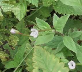 どこが面白いかというと、花びらが薄いピンクの4弁ですが、その真ん中のメシベの形が天狗の鼻のような形なのです。